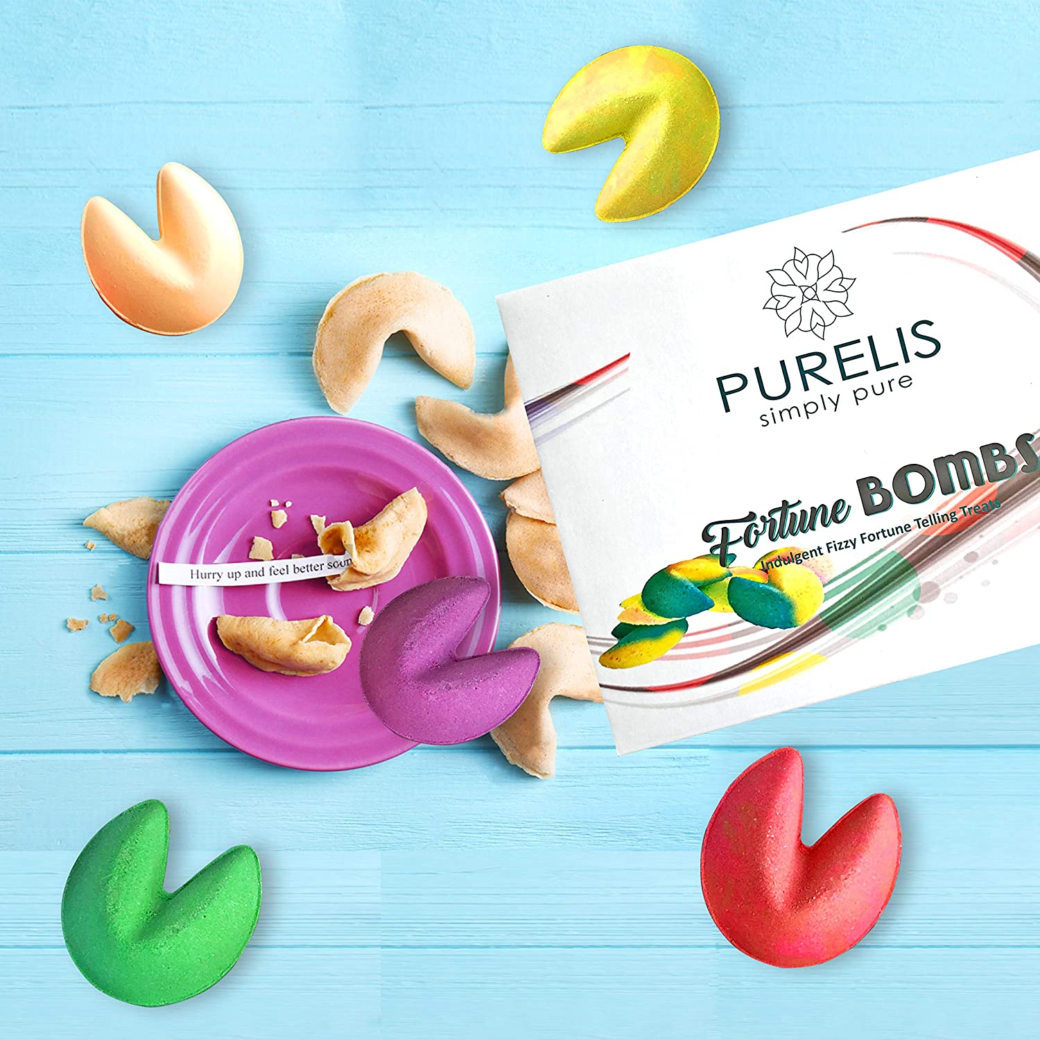• Reveal your fortune Spa Gift Set: 🥠 Purelis Fortune Cookie bath bombs float, spin, bubble and mix the most bright, vibrant colors to transform your bath into a magical spa oasis! Unique Fortune Messages in every fortune cookie bomb takes your bath experience to the next level!