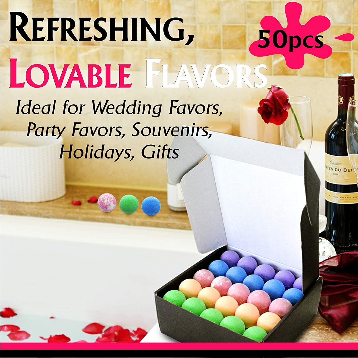 • Gift set includes 50 Bath Bombs, 2.5 oz each, individually wrapped in a gift box. With our 5 most popular scents: Eucalyptus Mint, Lavender, Jasmine Rose, Tea Tree, and Sweet Orange.