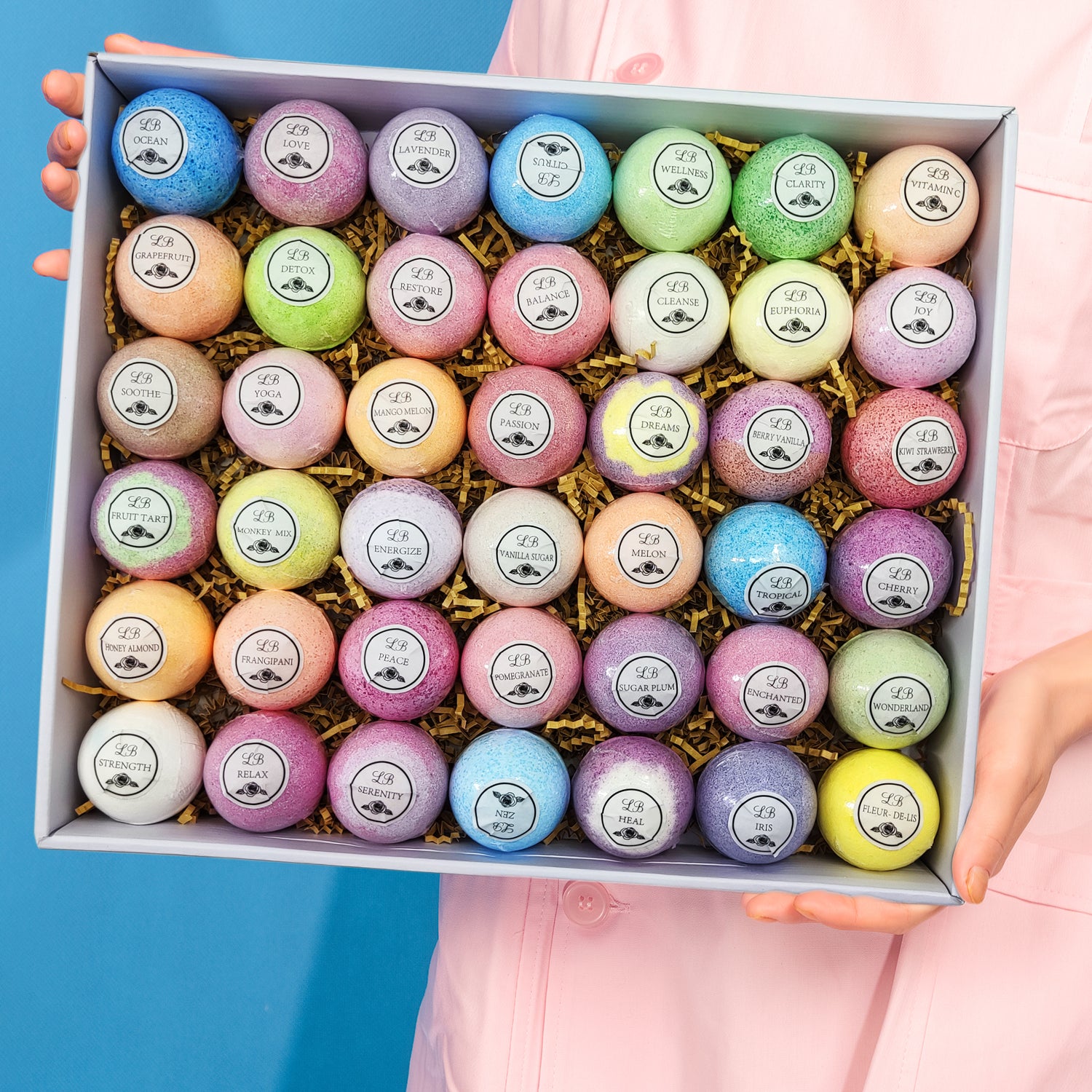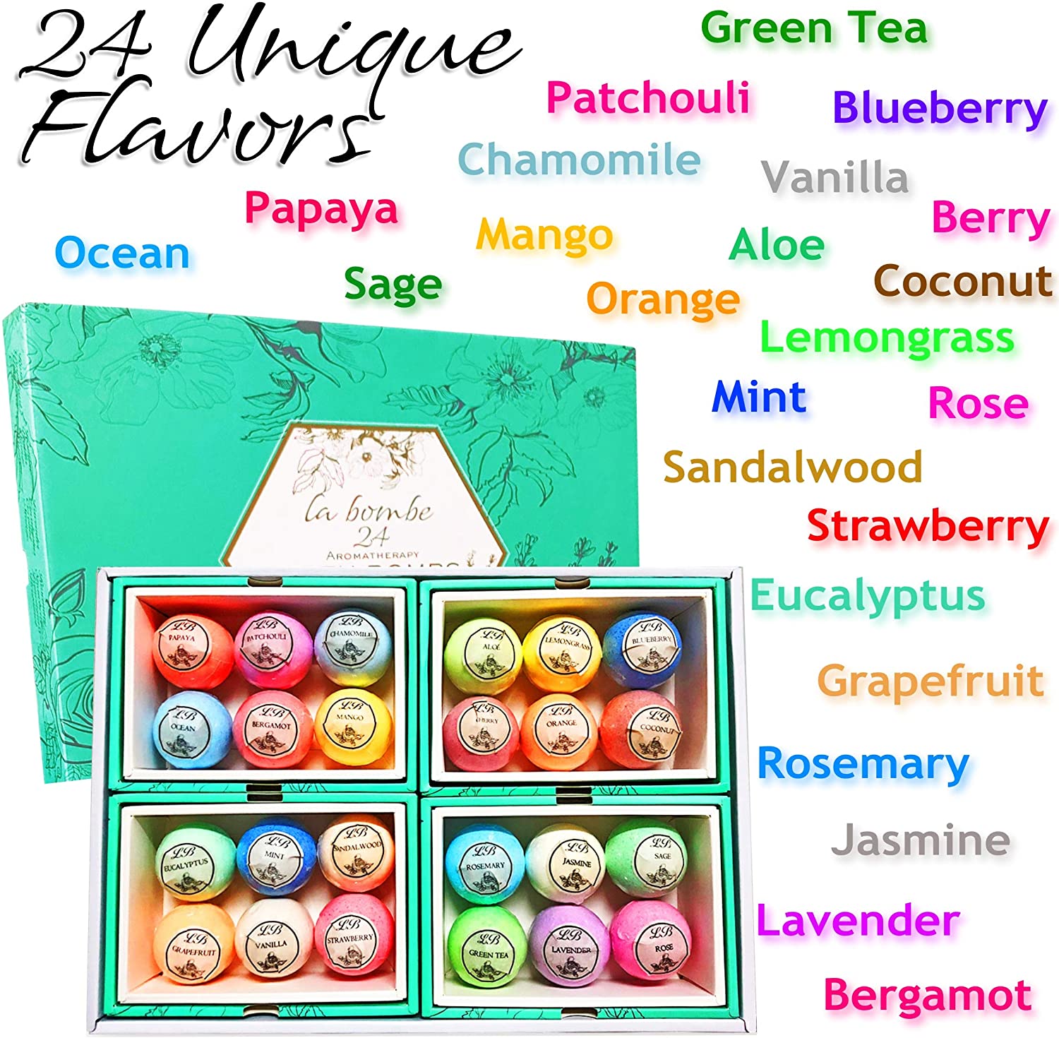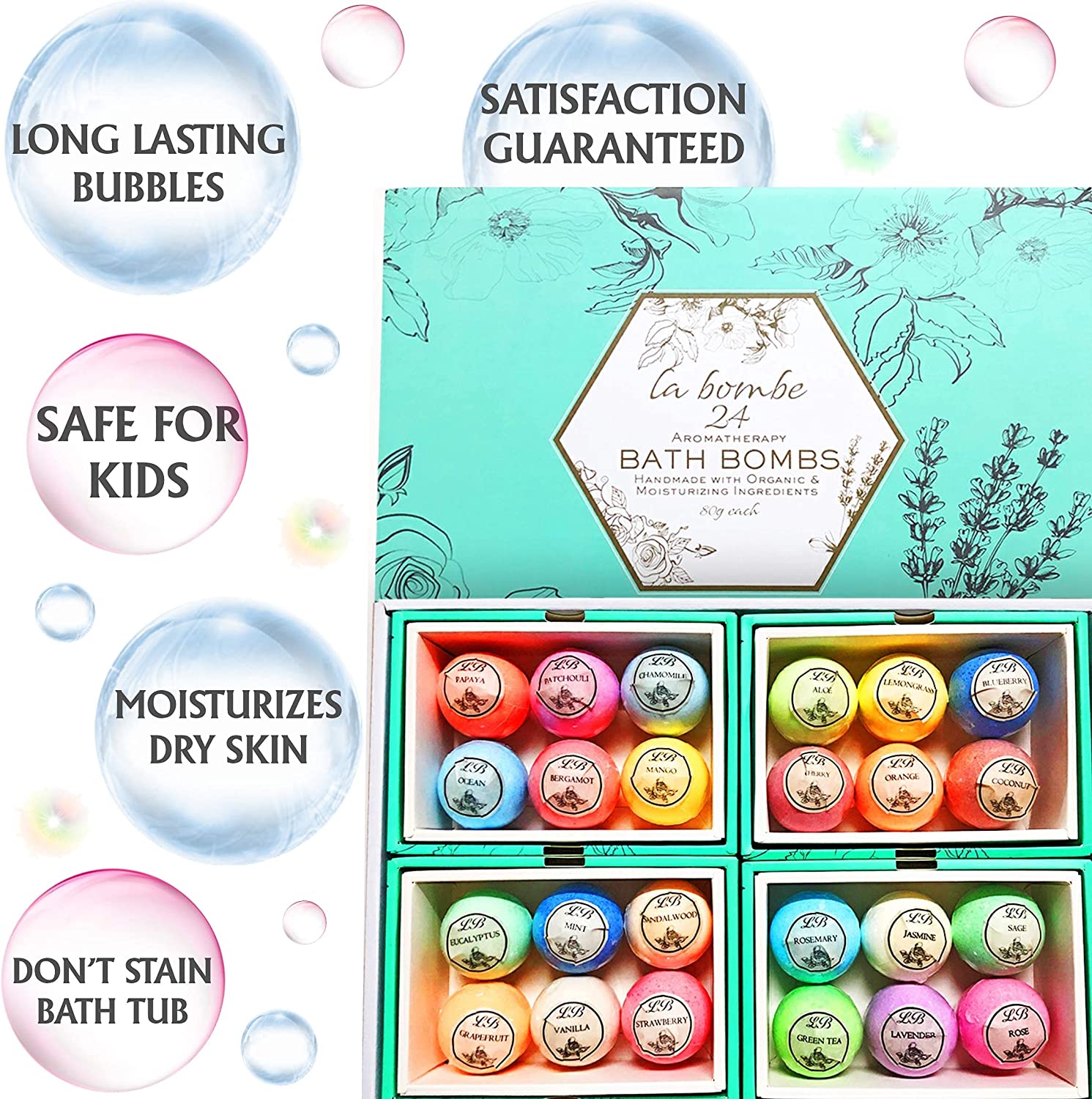 MOST WISHED FOR GIFT: Do you need a gift for the holidays, a birthday present for mom or dad, or a best friend gift? Don't forget realtors, new moms, housewarming parties and Teachers Gifts! Each bath bomb is individually wrapped, beautifully packaged in a gift box! Safe for kids and beloved by all ages, this Bath Bombs 24-Piece Gift Set is great for any gift-giving occasion.