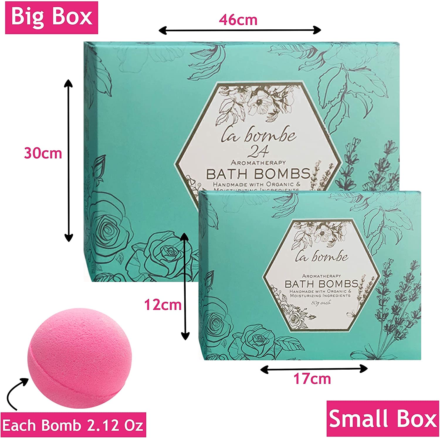 La Bombe Bath Bombs Gift Set: Contains 24 Bath Bombs 2.82oz each in four smaller gift boxes. Each box contains different fragrances, and is a perfect gift idea for Birthdays, Christmas, Mother's day, teens, and kids. Each Bath Bomb Gift Set can be gifted as a full set of 24 or gift the 4 small box sets of 6 bath bombs each. Perfect size gifts for any occasion! Make that special day glorious with a La Bombe Gift Set!