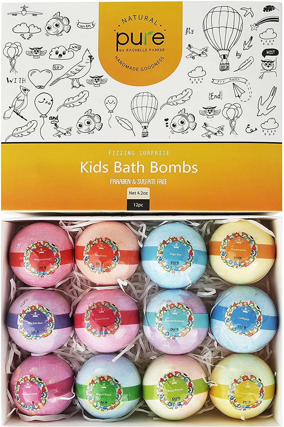 • FIZZY EXPLOSION OF COLOR AND SMELL: Kids bath bombs are the perfect size for men & women too -with just enough ingredients, & fragrance to fill your bath with silky beautifully scented skin- safe colorants and unique heavenly aromas! Bomb gift set contains these 12 beloved bomb flavours; Watermelon, Mermaid, High Sky, Dreamsicle, My Garden, Cotton Candy, Sweet Dreams, Lollipop, Gingerbread, Beach Blast, Fruit Punch and Pineapple Pie.
