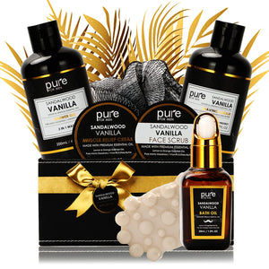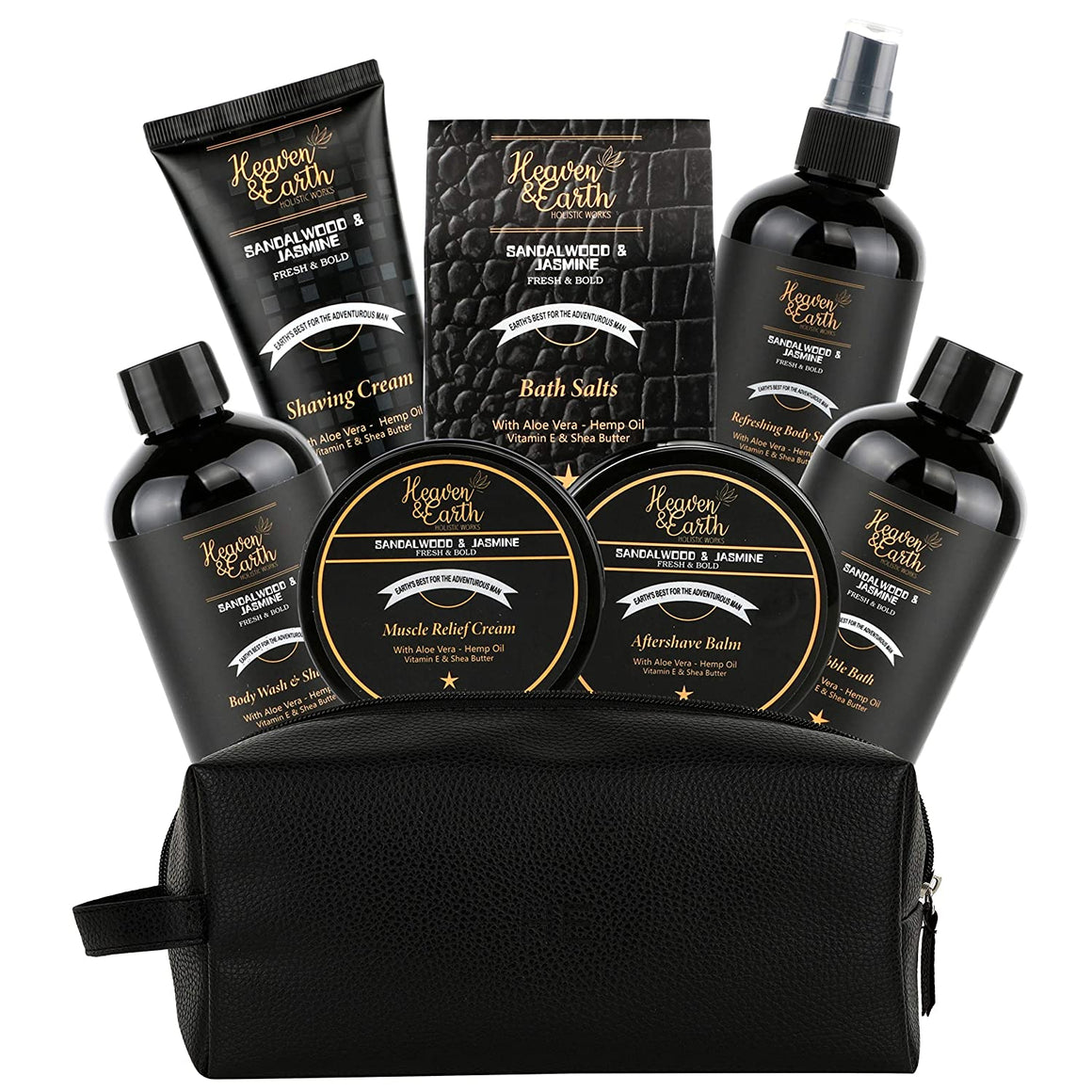 Gift Set For Men Sandalwood Vanilla 7pc Natural Bath & Body Tote - Luxury Shaving...