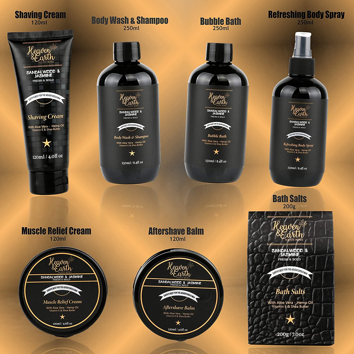 • EXCLUSIVE FORMULA 🎩Naturally formulated with shea butter, aloe vera, and Pure essential oils. Heaven & Earth body essentials will hydrate, renew and restore skin, leaving your body feeling soft and nourished with every use. Each Spa Gift Set includes Sandalwood & Jasmine essential oil bath and body products.
