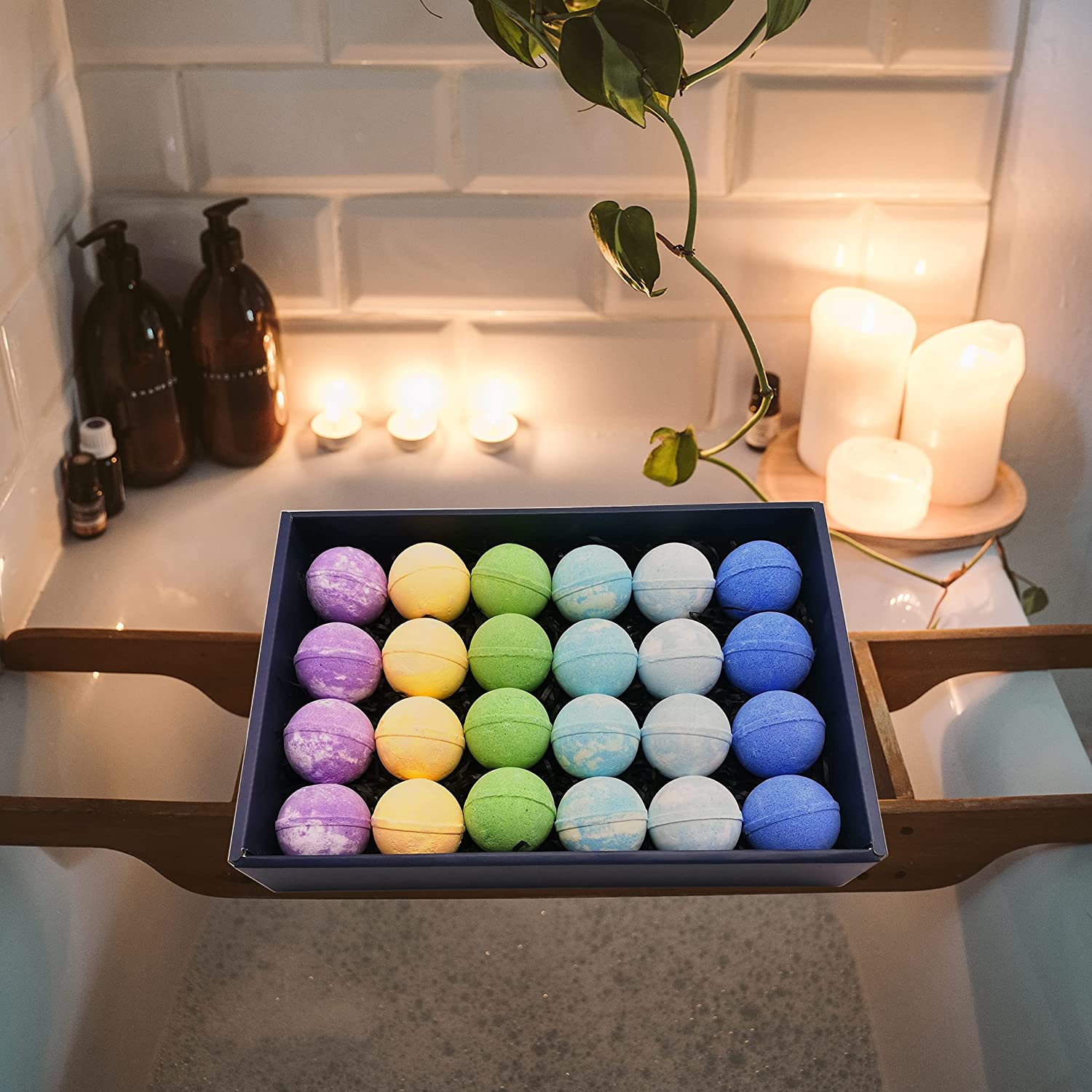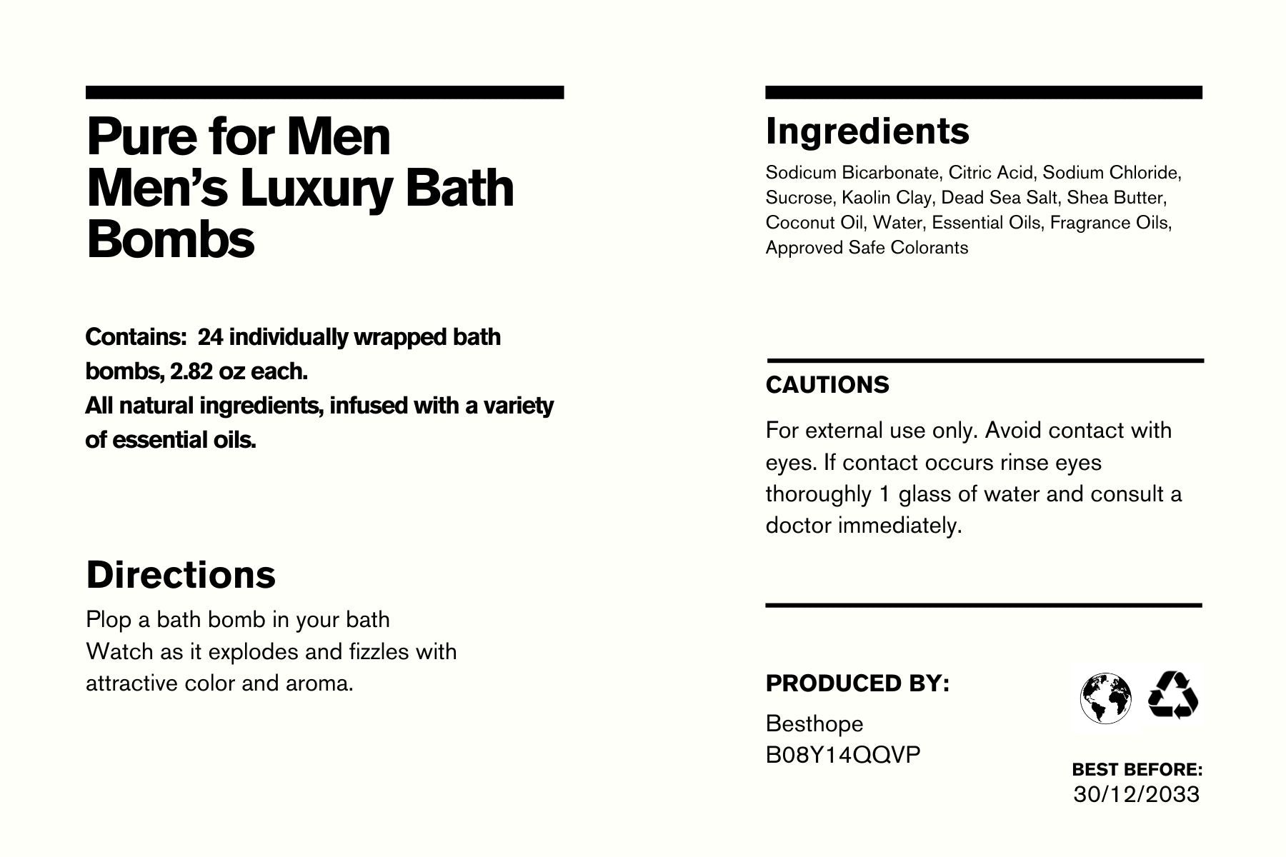 • CURATED EDITION: This 24 piece bath bomb gift set contains the bath bombs that customers wanted most - our 6 top rated masculine scents giving you 4 of each enticing aroma. Each one is infused with a different therapeutic grade essential oil – Lavender, Sweet Orange, Eucalyptus, Peppermint, Rosemary & Chamomile. Includes a pin to open the bath bombs - hassle free bath bombs for real men!