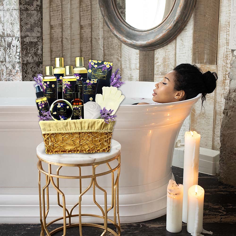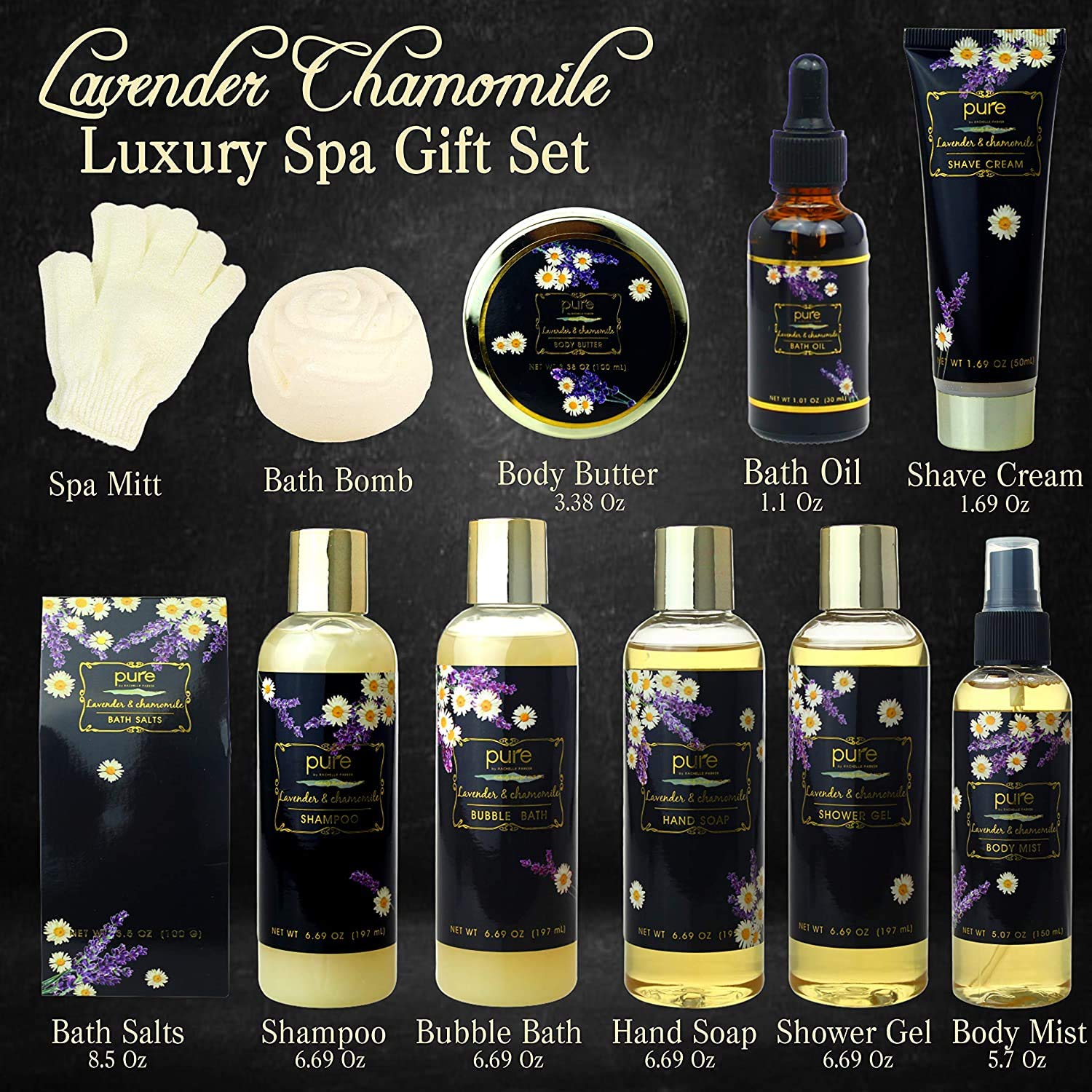 • SHOW STOPPER GIFT FOR MEN & WOMEN! Deluxe Lavender Chamomile Aromatherapy-edition to Rachelle Parker's best-loved bath gifts! Premium Presentation in Beautiful Basket! Includes – Shampoo, Shower Gel, Hand Soap, Body Mist, Bubble Bath, Body Butter, Bath Oil, Bath Salt, Flower Bath Bomb, Spa Mitts, Shave Cream, all in a beautiful basket. Paraben Free & Cruelty Free. Each spa gift set comes beautifully shrink-wrapped with a gift tag, making it the perfect, luxurious gift! Treat your special someone, or take the spa experience home with you in an upscale fashion!
