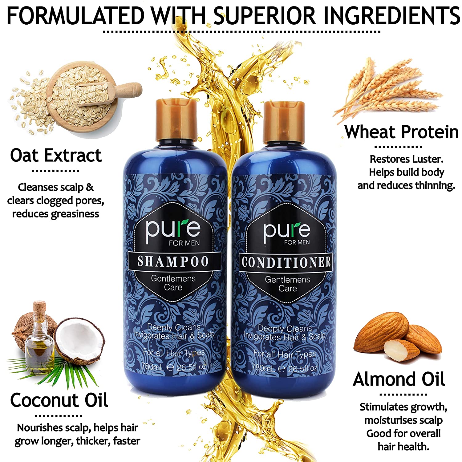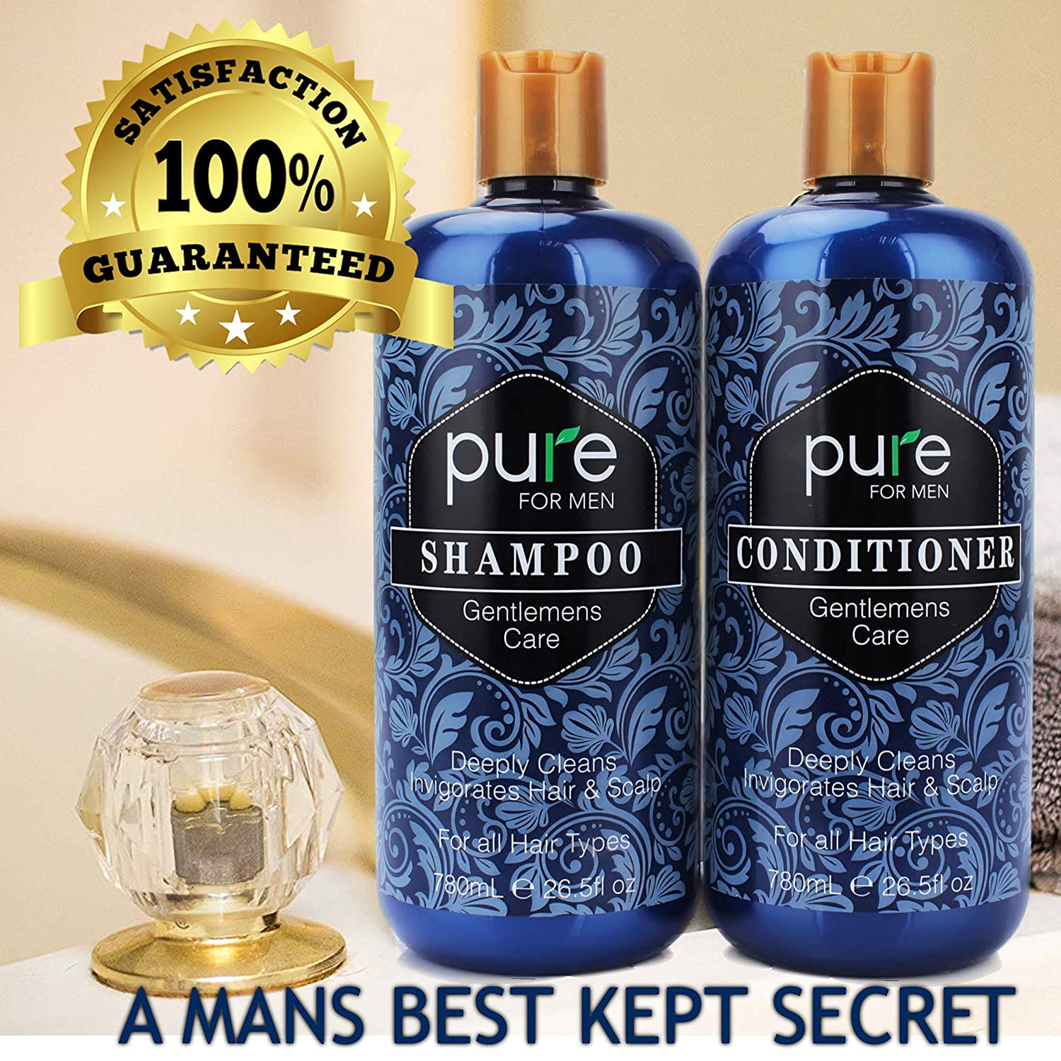 • ⭐LUXURY HAIR CARE: Supports healthier hair growth for men and women. Pure Shampoo and Conditioner for Men repairs damage from styling products, chemicals and smog. Recovers hair from daily stress of pollution and styling. Balancing and daily wash formulated to deep clean, clarify, and rejuvenate your hair while volumizing and thickening.  Leaves hair with a fresh, muscular scent