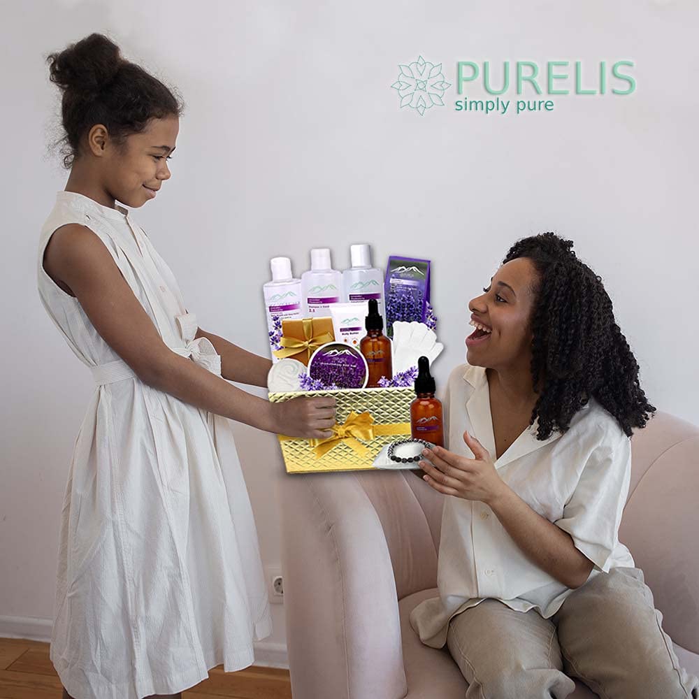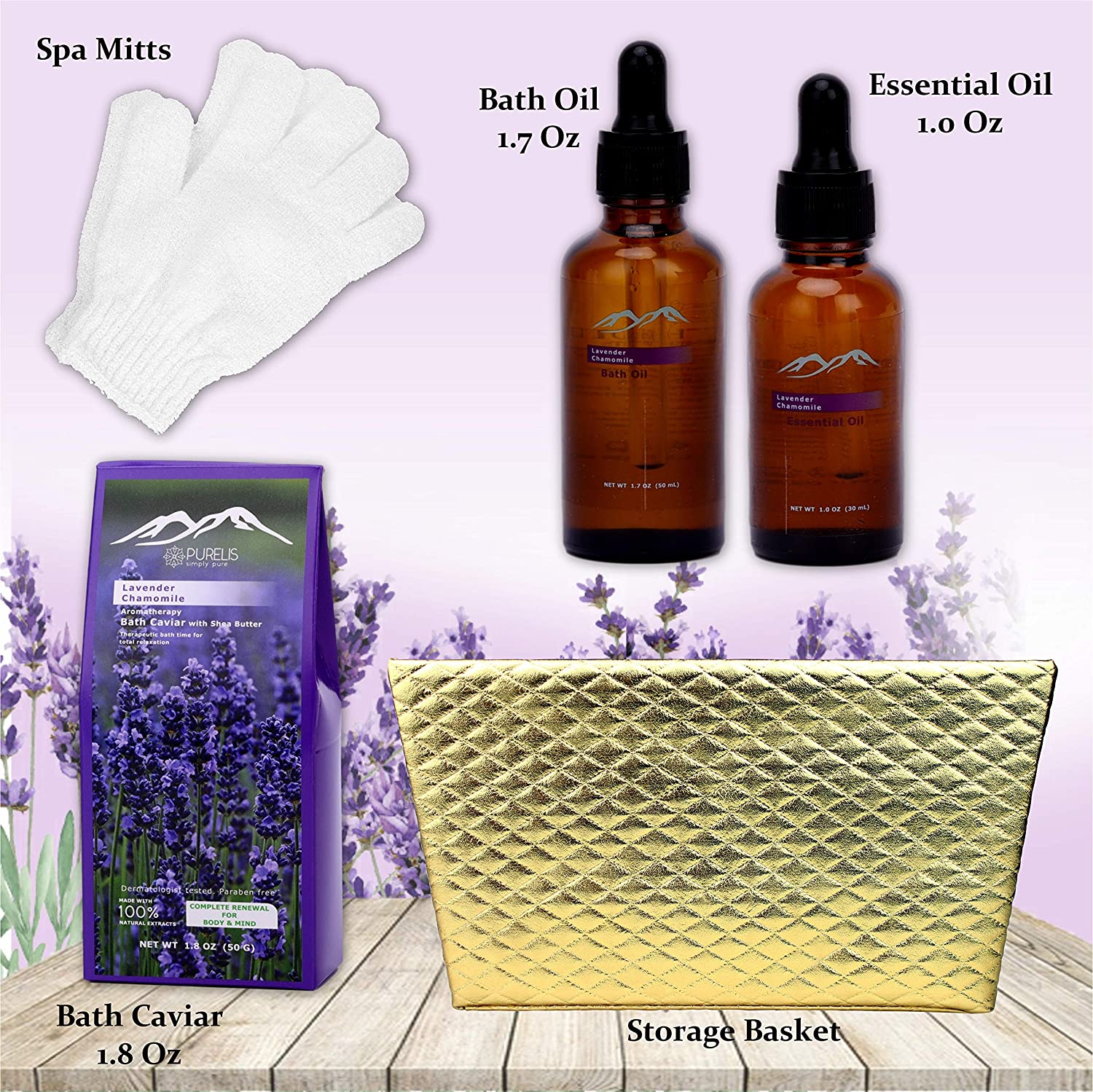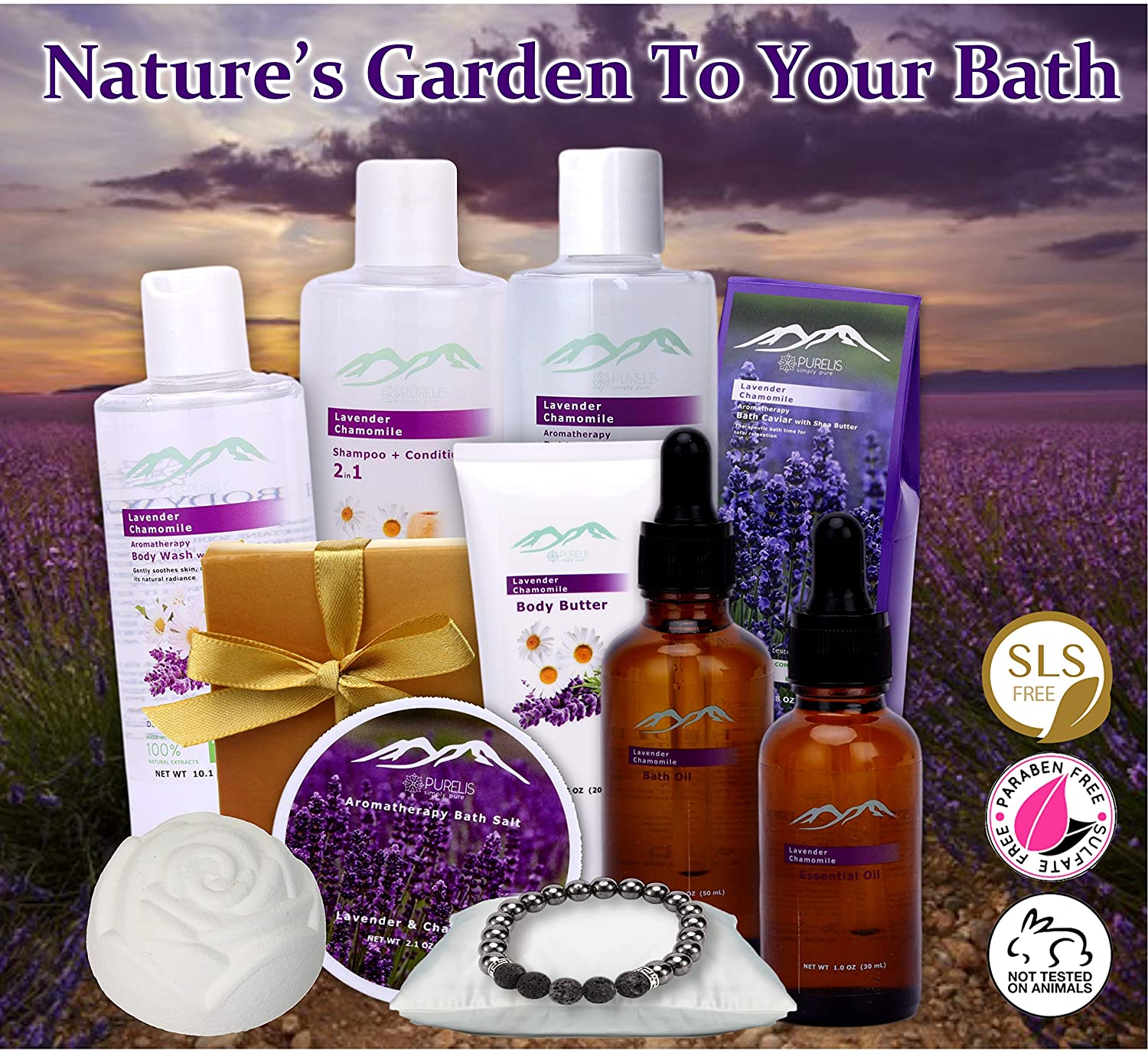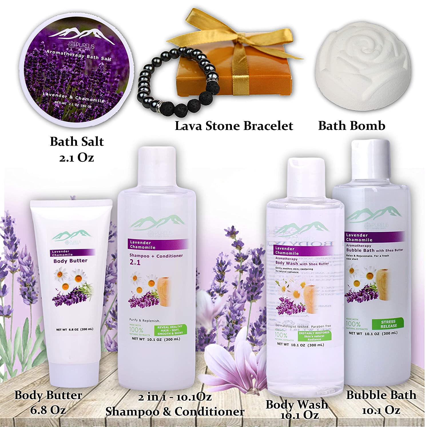 Lavender Chamomile 12-Piece Spa Gift Basket with Aromatherapy Lava Bracelet