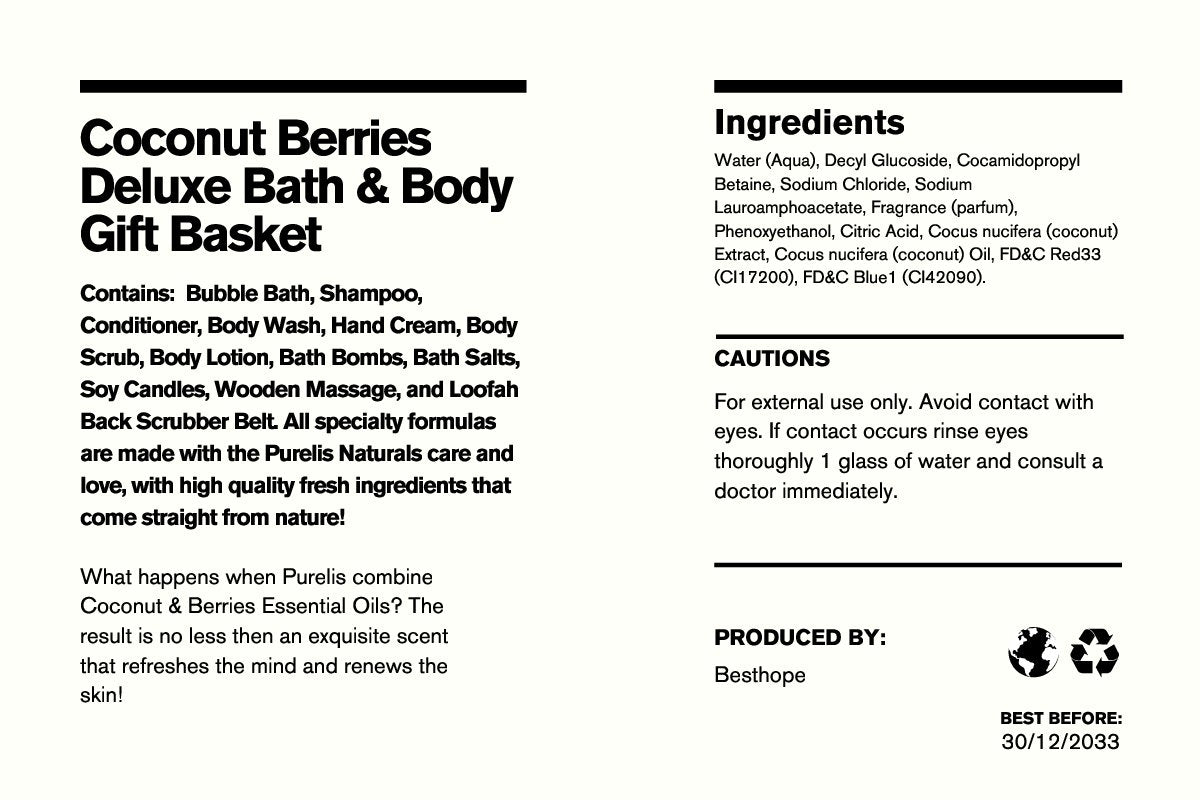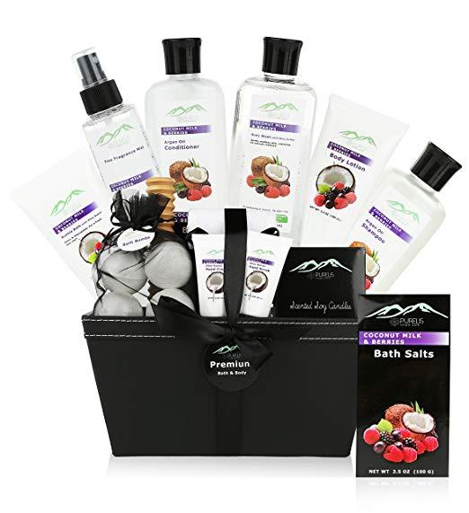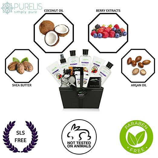 ● Pamper her with THE ULTIMATE GIFT BASKET of Indulgence & Relaxation. Purelis Berry Spa Basket will give her a crash course in the Three R's Treatment. Renew... Recharge... Rejuvenate.● Sensational Spa Goodies with our breathtaking coconut milk & berry crush to nourish the skin & body and soothe the soul. Starting with Loofah Back Scrubber, Wooden Massage, & Shea Butter Bath Bombs● We then add Luxurious Shampoo, Conditioner Body Wash, Bubble Bath,Bath Salts, and Perfumed Body Lootion all in our nourishing coconut & berries specialty formula● For the premium collection we make it even better with Shea Butter Hand Cream, Hand Scrub &Body Mist. To complete the spa experience light the soy scented candles to ensure the greatest home Spa Experience. Redefine Luxury with this 1-of-a-kind DELUXE SPA PACKAGE!!● Wrapped & Ready for delivery. Just add your personalized gift note & WOW your loved one today! We know its hard to buy a gift online.. Buy with peace with this basket you are covered by our 1000% Satisfaction Guarantee.